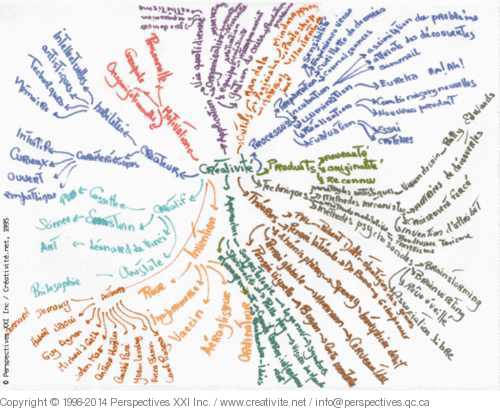 Vous êtes ici: Accueil > Ressources en créativité > Galerie virtuelle: Processus créatif et pensée visuelle > Diaporamas: Présentations visuelles sur Créativité.net > Carte mentale et schéma heuristique en exemple > Carte mentale: Trouver les idées clés du mot créativité (1 de 8)