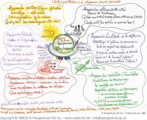 Vous êtes ici: Accueil > Ressources en créativité > Galerie virtuelle: Processus créatif et pensée visuelle > Diaporamas: Présentations visuelles sur Créativité.net > Carte mentale et schéma heuristique en exemple > Topogramme: Six chapeaux d'Edward de Bono (8 de 8)